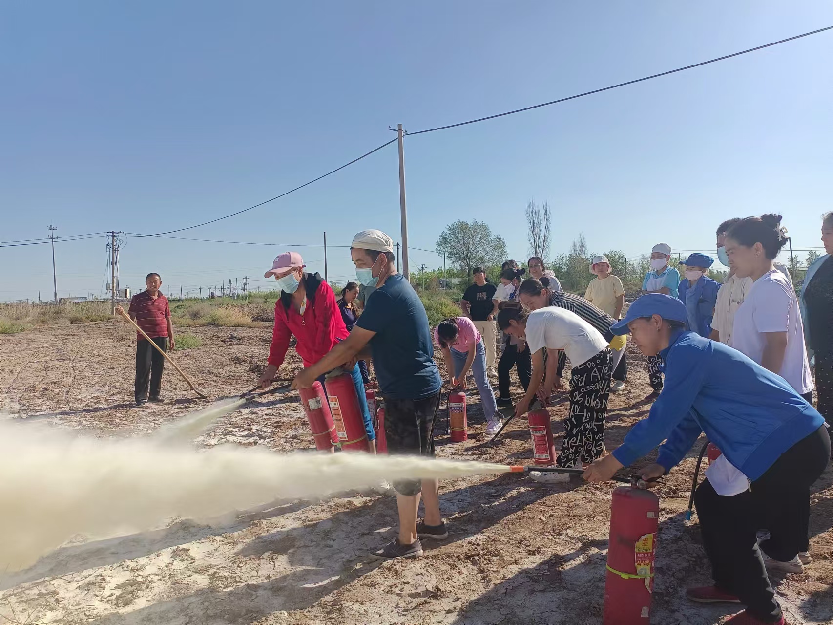在空曠安全的場地設置火源,參演人員按照正確的操作步驟使用干粉滅火器進行滅火演練。